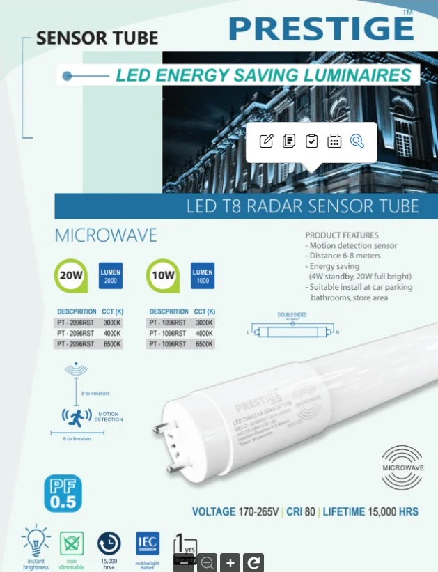 Overall, the Prestige LED tube combines smart sensor technology, high brightness, and energy efficiency. Because of its automatic operation and reliable design, it is an excellent choice for facilities that require convenient and cost-effective lighting solutions.